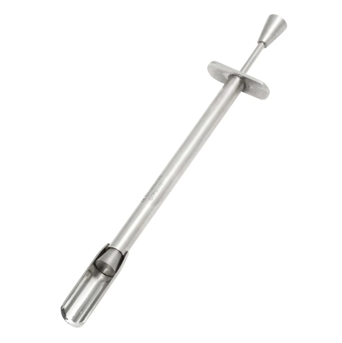 100% Chef olijfvuller, vervaardigd uit roestvrij staal. De totale lengte van de vuller is 13,8 cm, de vuldiameter is 7 mm en de vuldiepte is 2,8 cm. Gebruik het gereedschap voor het vullen van olijven met een vulling naar keuze. Bijvoorbeeld amandel of paprika.