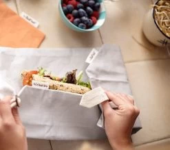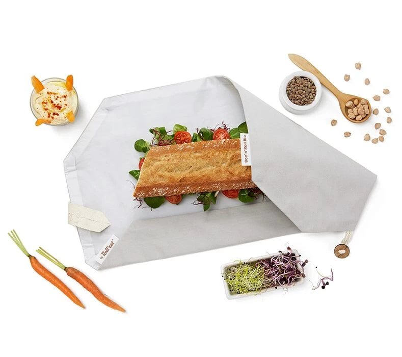 Het grijze by Roll’eat Boc’n’Roll herbruikbare boterhamzakje is een duurzaam alternatief op plastic wegwerpzakjes. Het zakje is geschikt als placemat, gemakkelijk te reinigen en vervaardigd van 100% biologisch katoen met een binnenlaag van biologisch, composteerbare folie. Uitgevouwen heeft de by Roll’eat Boc’n’Roll een afmeting van 45 x 32 cm, opgevouwen een afmeting van 11 x 15 cm.