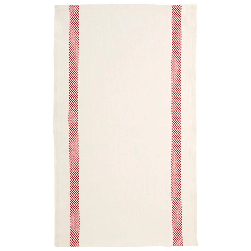 De Charvet LUSTRUCU theedoek is vervaardigd uit 100% linnen. De theedoek is geweven in een witte kleur met aan beide lange zijdes een streep met wit/rode blokken. Het doek is 75 cm lang en 45 cm breed. Gebruik voor het drogen van uw afwas.