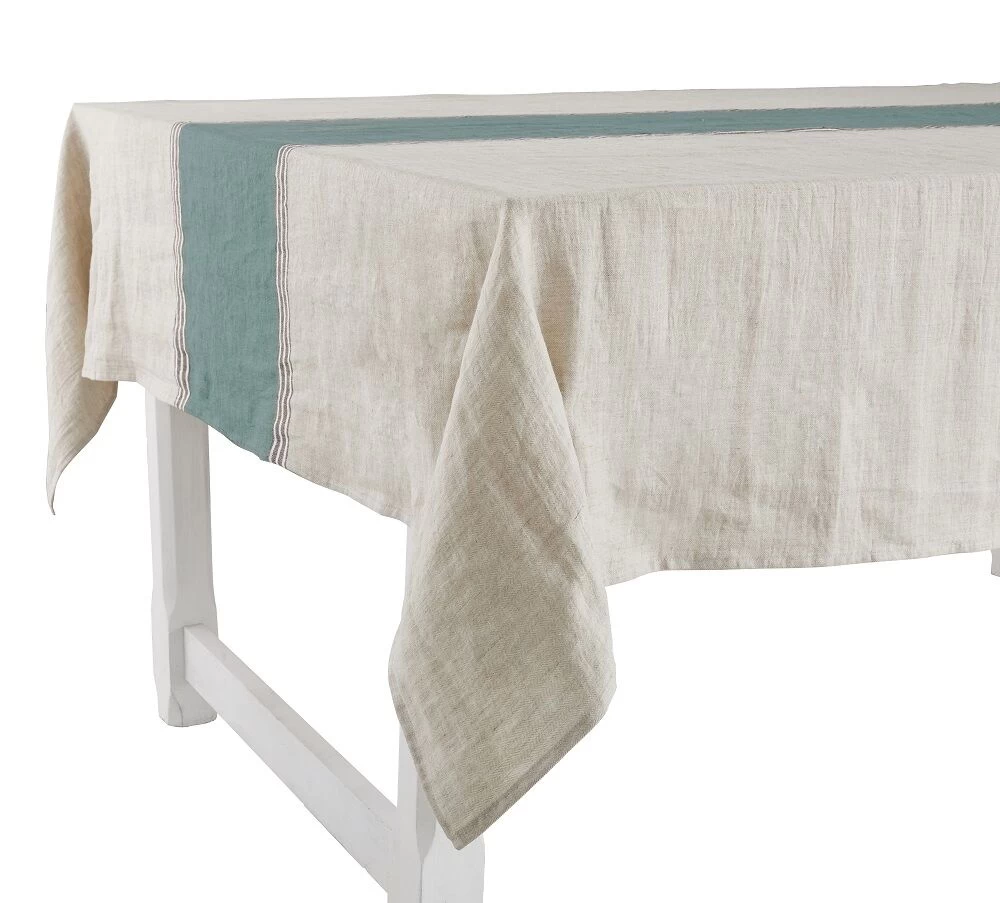 Het Charvet RIALTO tafellaken is vervaardigd uit 94% linnen en 6% polyester. Het tafellaken is geweven in een beige kleur en is in het midden voorzien van een brede blauwe streep. Het tafelkleed heeft een lengte van 275 cm en is 180 cm breed. Gebruik het tafellaken ter decoratie en als bescherming van uw tafel.