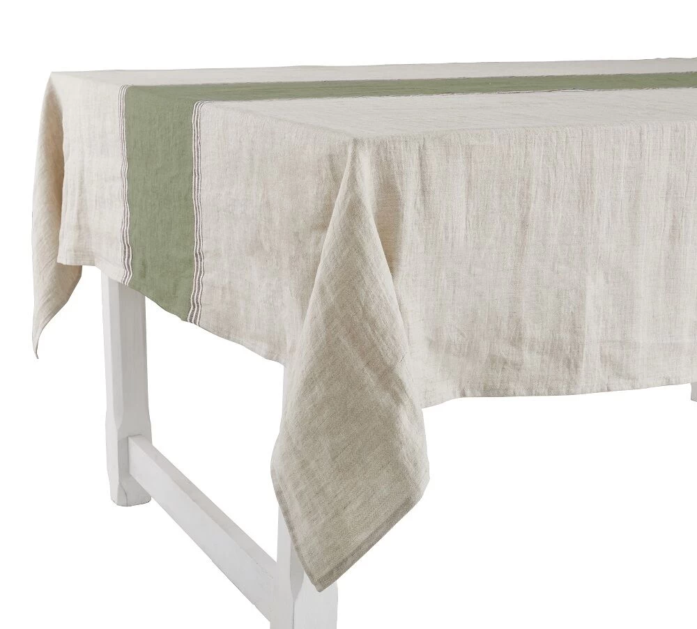 Het Charvet RIALTO tafellaken is vervaardigd uit 94% linnen en 6% polyester. Het tafellaken is geweven in een beige kleur en is in het midden voorzien van een brede donkergroene streep. Het tafelkleed heeft een lengte van 275 cm en is 180 cm breed. Gebruik het tafellaken ter decoratie en als bescherming van uw tafel.