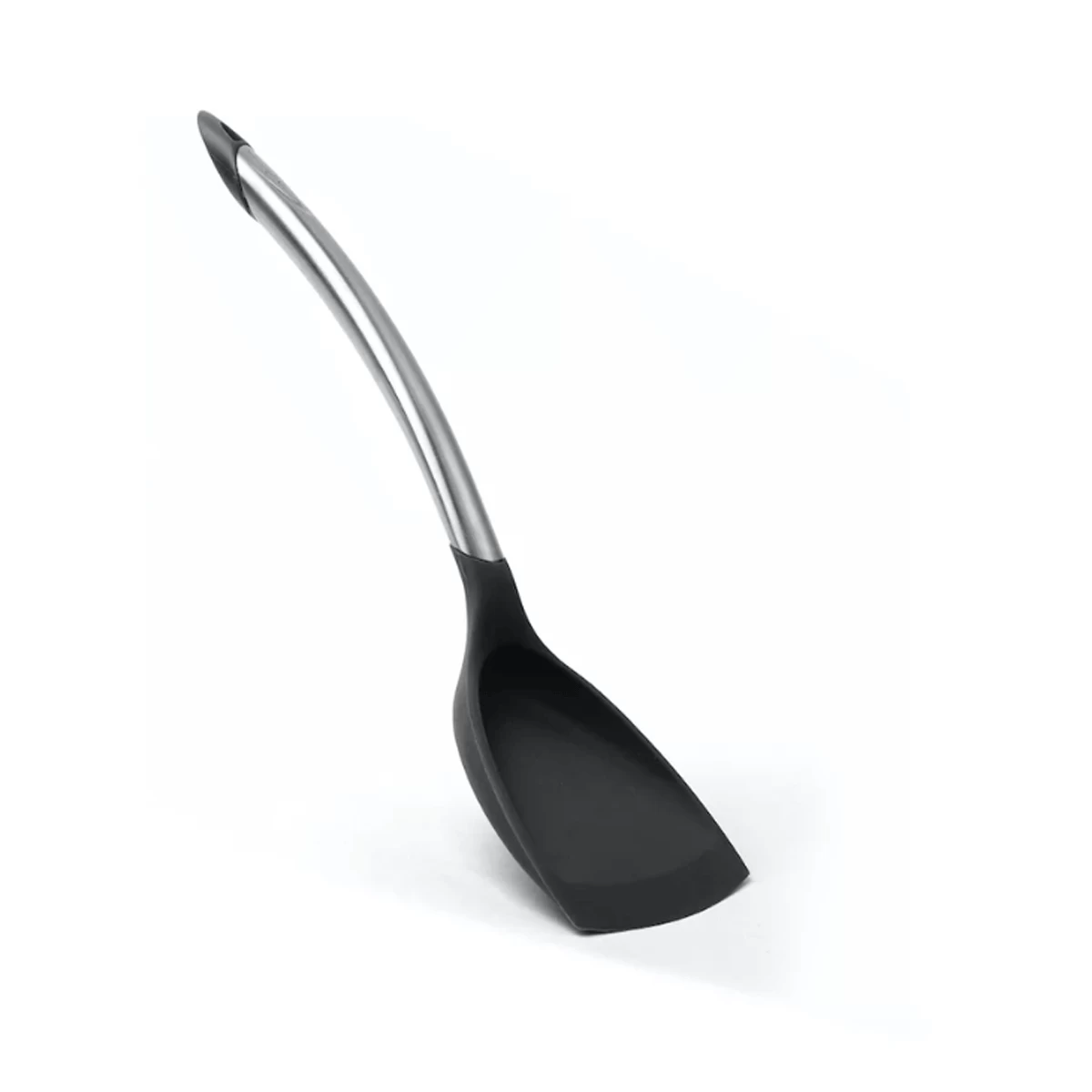 De Cuisipro wokspatel is vervaardigd uit roestvrij staal met een zwart siliconen blad, waardoor de spatel niet krast. De spatel is 10 cm breed en 32 cm lang. Gebruik de wokspatel voor het veilig wokken en omroeren van bijvoorbeeld groente of een rijstgerecht.