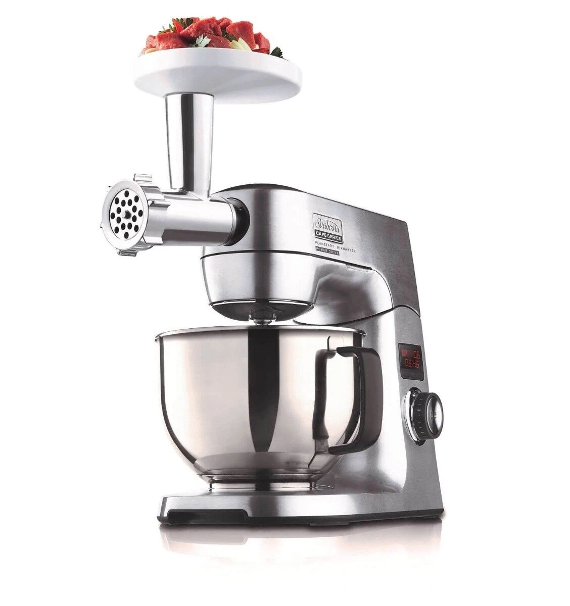 De planetarische mixer gebruikt u voor het mengen, mixen en kneden van bijvoorbeeld deeg, beslag en slagroom. Planetarisch betekent dat de garde in kwestie zowel een ronde maakt als om de eigen as draait, en zo heel efficiënt rondgaat. Op de voorzijde van het apparaat zit een aansluitpunt voor verschillende accessoires, waaronder de meegeleverde multimolen. Deze kunt u gebruiken om verschillende soorten voedsel fijn te malen, zodat u bijvoorbeeld uw eigen gehaktmengsel kunt bereiden.