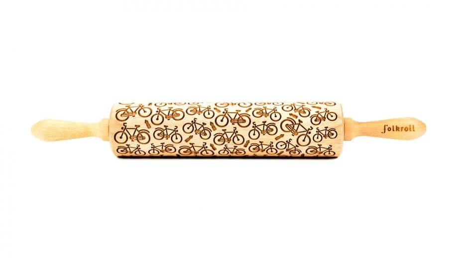 De Folkroll-deegroller Medium met het patroon Bikes is vervaardigd uit beukenhout. Het bedrukte deel van de deegroller is 19 cm lang, en heeft een diameter van 4,5 cm. De gehele deegroller heeft een lengte van 37 cm. Gebruik de Folkroll-deegroller voor het decoreren van koekjesdeeg, chocolade, suiker, marsepein, zout, keramiek of kleiproducten.