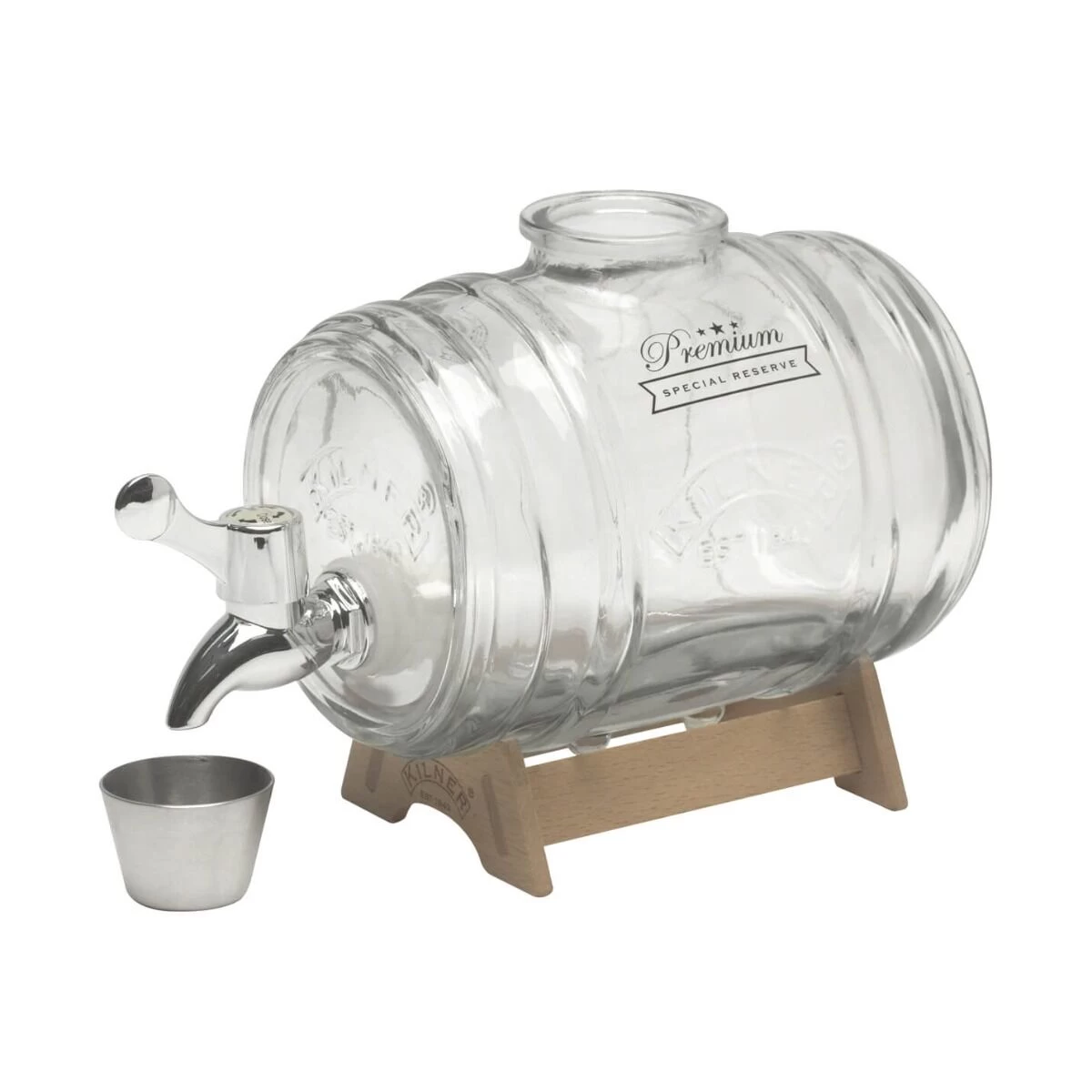 De glazen Kilner Barrel dispenser heeft de vorm van een wijnvat en is voorzien van een tapkraantje, de stop kan worden gebruikt als jigger. De dispenser heeft een inhoud van 1 liter en wordt geleverd met een houten standaard. De dispenser is 22 cm lang, 12 cm breed en 16 cm hoog. Gebruik de Barrel dispenser voor het serveren van whiskey, rum en andere dranken.