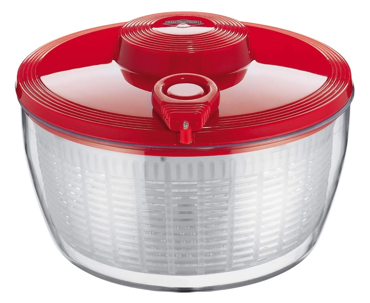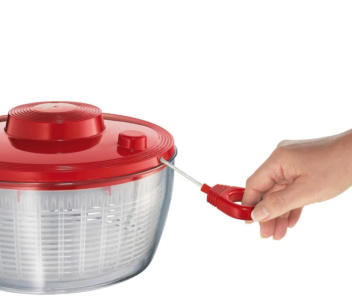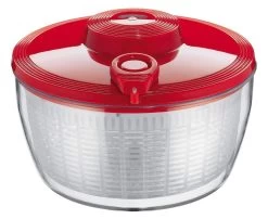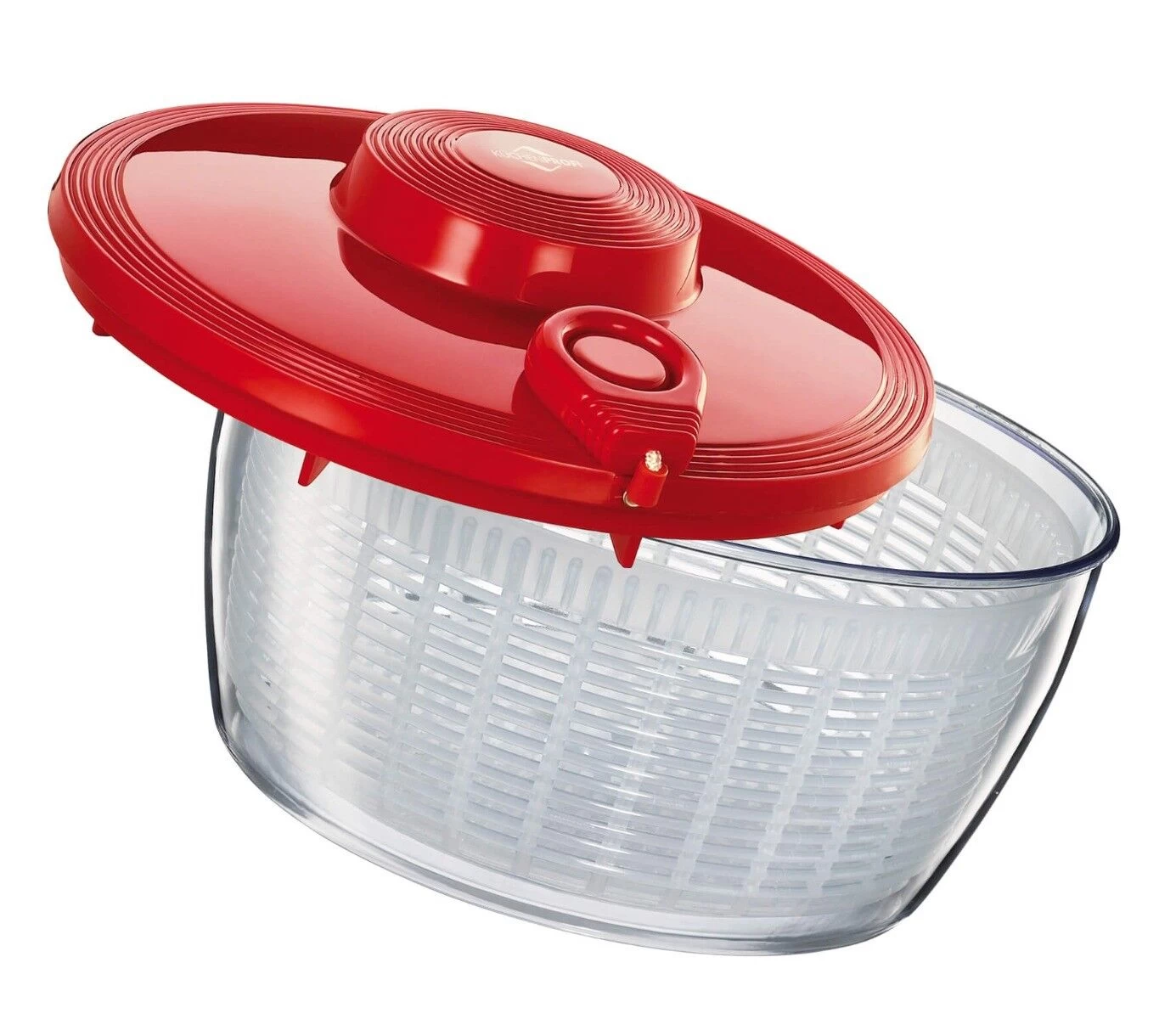 De Küchenprofi slacentrifuge is vervaardigd uit transparant en rood kunststof en heeft een inhoud van 3,25 liter. Vul de centrifuge met bijvoorbeeld veldsla, rucola en ijsbergsla om deze te wassen en te drogen.