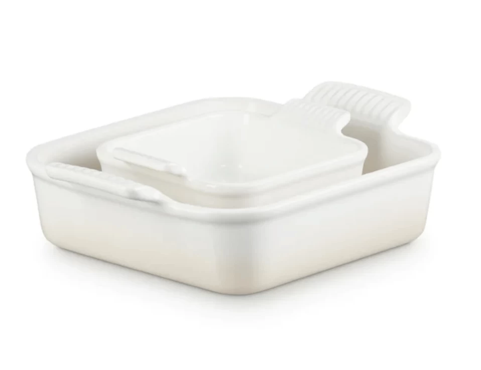 Deze Meringue, crèmekleurige ovenschalenset van Le Creuset bevat twee vierkanten ovenschalen van 13 en 20 cm. De schalen zijn gemaakt van aardewerk met een geglazuurd oppervlak wat kras- en vlekbestendig, geur- en smaakneutraal is. Voor het bereiden van bijvoorbeeld ovenschotels, voor 1 tot 2 personen.