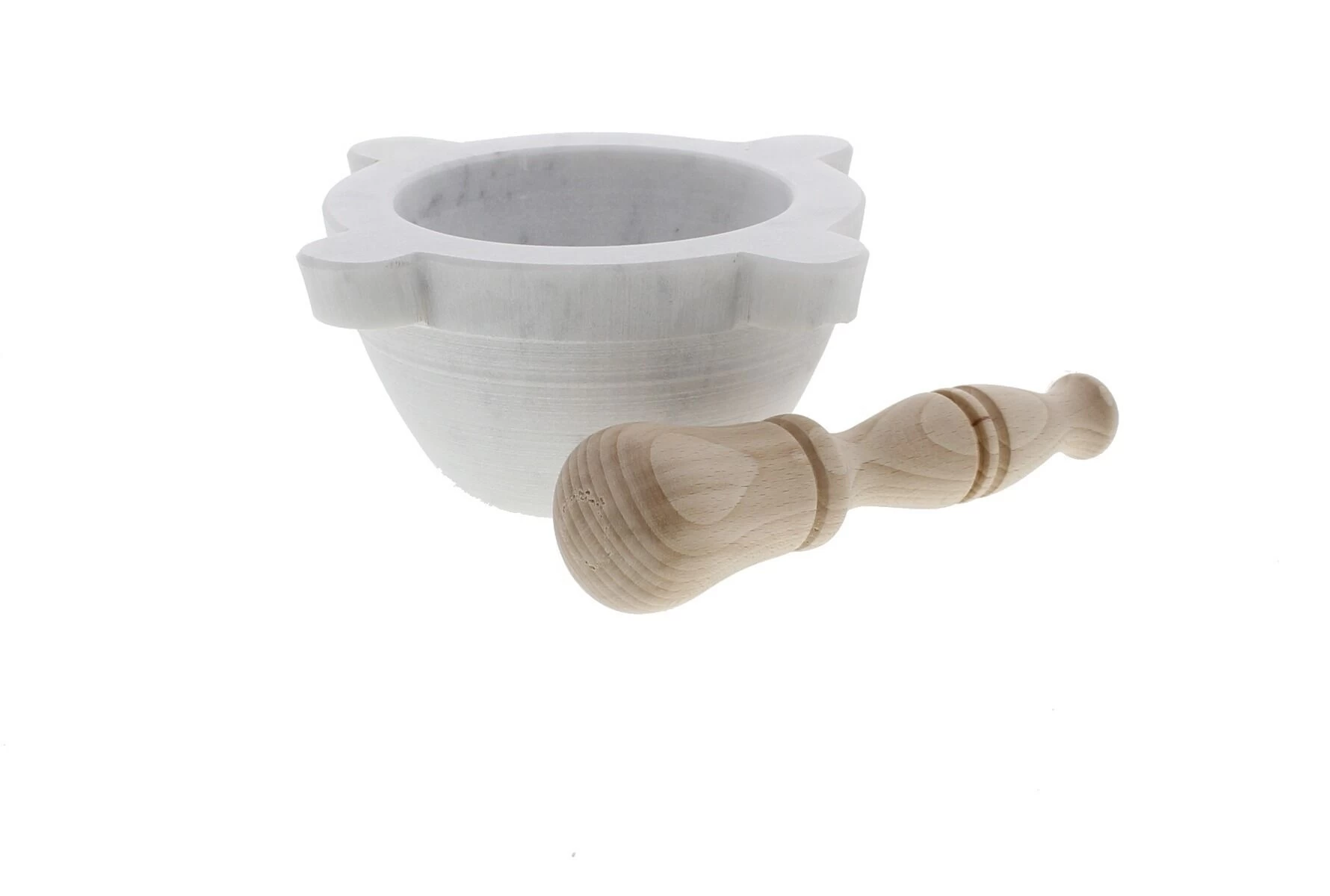 De witte Marmotecnica vijzel heeft een handzame doorsnede van 10 cm. Hierdoor is hij perfect voor het vijzelen van kleine hoeveelheden of kleine gerechtjes. De vijzel wordt compleet geleverd met een bijzonder gevormde houten stamper. De binnenzijde van de vijzel is glad afgewerkt, waardoor u uw ingrediënten nog gemakkelijker mengt en fijnmaalt. De vijzel is gemaakt van massief marmer en blijft tijdens gebruik stevig op zijn plaats.