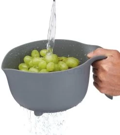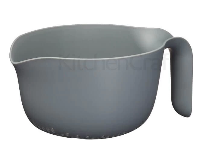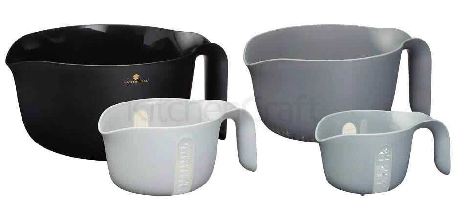 Deze MasterClass kommenset incl. maatbekers en vergiet biedt de perfecte basis voor iedere bakker. De set bestaat uit 4 delen: een vergiet, een mengkom, een grote maatbeker (1000 ml) en kleine maatbeker (500 ml). Deze zijn perfect stapelbaar en op te bergen tot een formaat van 30 cm x 23 cm x 10 cm. De kommen zijn gemaakt van mat, magnetronbestendig, BPA-vrij kunststof in verschillende grijstinten. Bovendien zijn de maatbekers voorzien van een transparante maataanduiding, wat zeer nauwkeurig afmeten mogelijk maakt. Dankzij de extra brede schenktuit mixt, verdeelt of giet u de inhoud met het grootste gemak over in een bakvorm of andere kom. Ook het mixen van grote hoeveelheden of zwaarder beslag is geen probleem: de ergonomisch gevormde handgrepen zijn afgewerkt met siliconen voor extra grip en veiligheid.