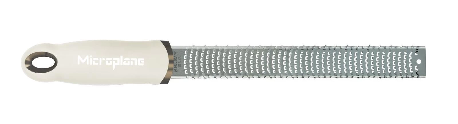 De Microplane Premium Series zesteur / rasp is vervaardigd uit roestvrij staal en kunststof in Cashmere Beige. De rasp heeft een fijn profiel voor het zesten van citrusschil en het raspen van harde ingrediënten als kaneel, nootmuskaat, Parmezaanse kaas en chocolade. Het raspoppervlak is 20 x 3 cm.