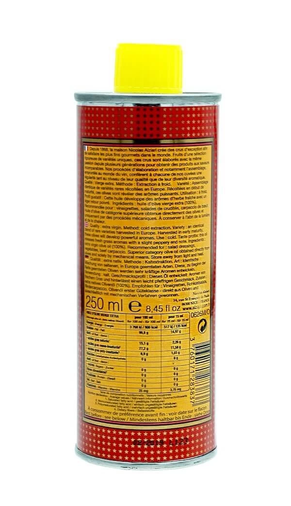 De Nicolas Alziari olijfolie is afkomstig van in Europa geteelde olijven. De koudgeperste olie is uiteraard extra vergine en vol van smaak.