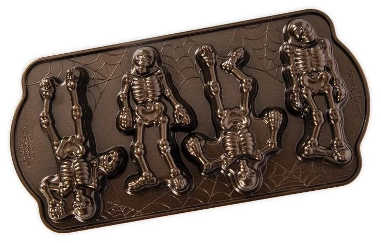De Nordic Ware Spooky Skeleton bakvorm is gemaakt van gietaluminium en heeft een totale inhoud van ongeveer 435 milliliter. Aan de buitenzijde heeft de vorm een bronskleurige coating. De vorm bestaat uit 4 mallen van een skelet-figuurtje. De vorm is voorzien van een antikleeflaag, voor een eenvoudige lossing van de inhoud. Gebruik de vorm voor het bakken van cakes.