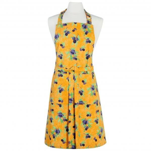 Het gele Now Designs schort is gemaakt van 100% katoen en voorzien van een olijvendesign. Het halterschort is verstelbaar en daardoor voor iedere volwassene geschikt. Het schort is 85 x 70 cm.