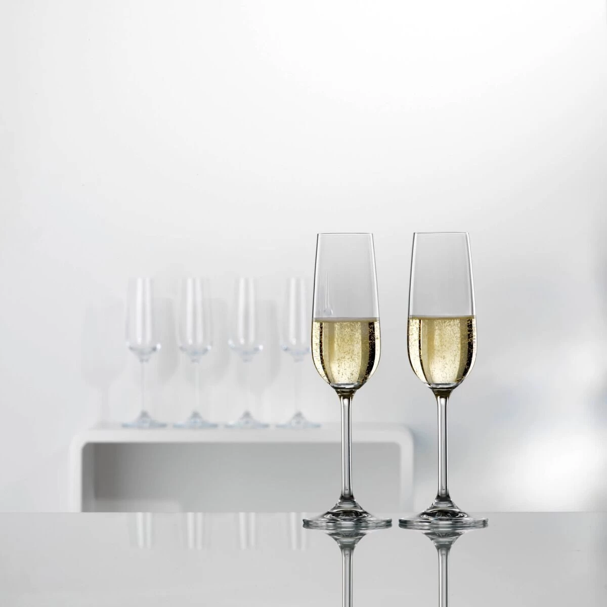 Het Oldenhof champagneglas is vervaardigd uit kristalglas en heeft een inhoud van 190 ml. Het glas is 22,7 cm hoog. De vorm van de kelk van het glas, maakt het glas perfect geschikt voor het drinken van champagne. Set van 6 stuks.