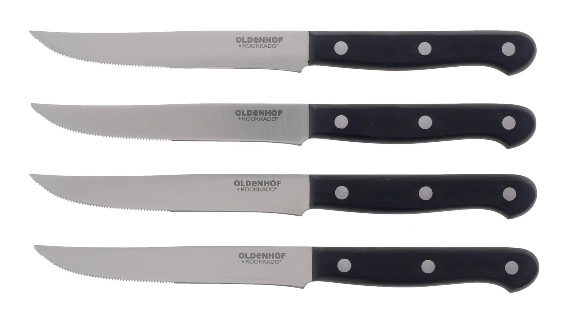 De set van 4 Oldenhof Solo steakmessen heeft een lemmet van messenstaal met een lengte van 13 cm. Het zwarte kunststof heft is met klinknagels vastgeklonken. De snede heeft een kleine kartel aan de voorzijde van het mes. U gebruikt het mes aan tafel voor het snijden van bereid vlees.
