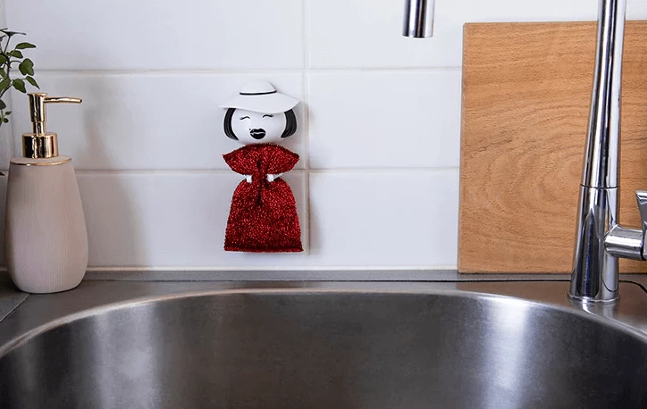 De Mrs. Sponge schuursponshouder is gemaakt van wit en zwart kunststof. Mrs. Sponge is vormgegeven als een dame met een hoedje op, wanneer er een schuurspons in de clip onder haar gezicht hangt lijkt het of Mrs. Sponge een rood jurkje draagt. De schuursponshouder is 9,7 cm lang, 8,3 cm breed en 5 cm diep.