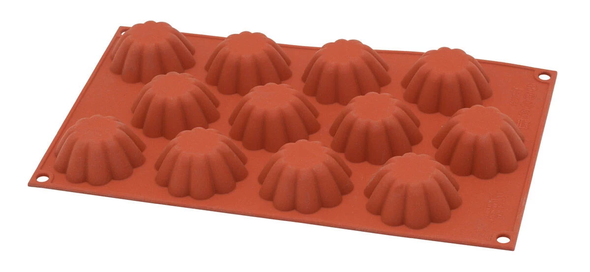 De Silikomart flexibele bakvorm heeft 12 vormen voor het bakken van kleine brioches of het vormen van pudding. Afzonderlijk hebben de vormen een diameter van 5,8 cm, hoogte van 2,2 cm en een inhoud van 33 ml. De gehele vorm is 30 cm lang en 17 cm breed met een totale inhoud van 396 ml.