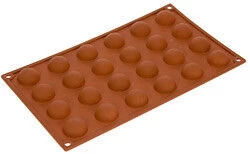 De bruine siliconen bakvorm van Silikomart bevat 24 halve bollen van petit-four formaat. Elk van de vormen heeft een diameter van 3 cm, is 1,5 cm hoog en heeft een inhoud van 10 ml. Doordat de bakvorm van silicone is, zal gebak gemakkelijk loskomen van de vorm na het bakken. De flexibele bakvorm is in zijn geheel 30 cm lang, 17 cm breed en heeft een gezamenlijke inhoud van 240 ml.