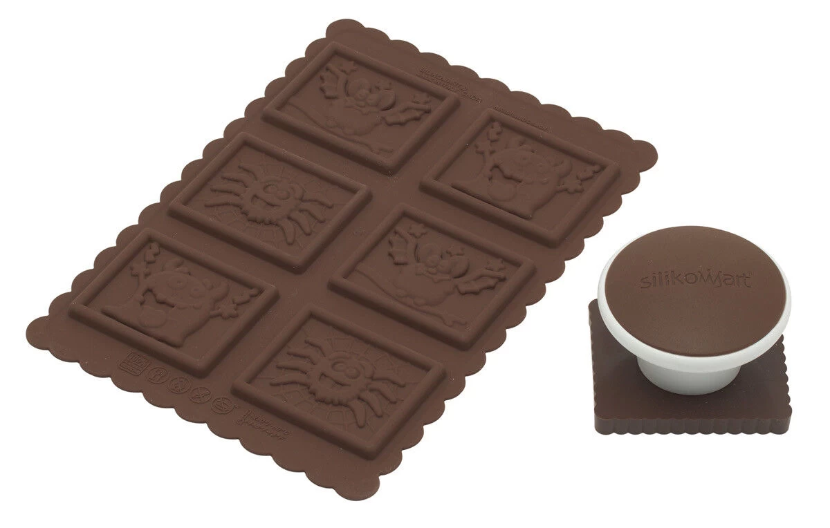 De Silikomart Cookie Choc Kit bestaat uit een kunststof uitsteekvorm in de vorm van een rechthoek, een siliconen mal en een receptenboekje. De siliconen mal bevat 6 vormpjes met daarop 2 x een spook, 2 x een vleermuis en 2 x een spin in een web. De recepten staan beschreven in een aantal talen, waaronder Engels. Met de Cookie Choc Kit bakt u koekjes van 6,7 x 5,8 cm met een chocolade of fruitgelei topping.