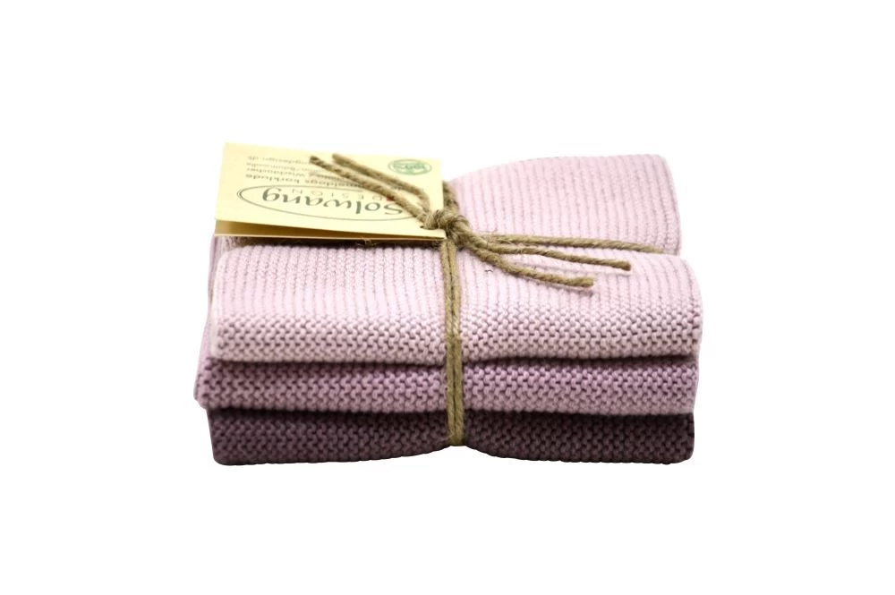 De Solwang Design vaatdoeken zijn vervaardigd uit 100% eco-tex katoen. De set van 3 vaatdoeken komen in 3 verschillende tinten paars. De doeken zijn 25 cm lang, 25 cm breed en hebben door de breitechniek uitstekende vocht opnemende eigenschappen.