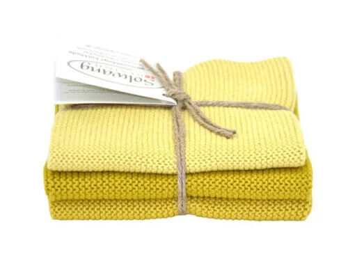 De Solwang Design vaatdoeken zijn vervaardigd uit 100% eco-tex katoen. De set van 3 vaatdoeken komt in de kleur mosterdgeel. De doeken zijn 25 cm lang, 25 cm breed en hebben door de breitechniek uitstekende vocht opnemende eigenschappen.