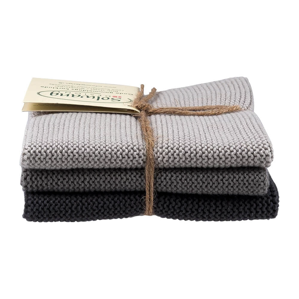 De Solwang Design vaatdoeken zijn vervaardigd uit 100% eco-tex katoen. De set van 3 vaatdoeken komt in drie kleuren grijs. De doeken zijn 25 cm lang, 25 cm breed en hebben door de breitechniek uitstekende vocht opnemende eigenschappen.