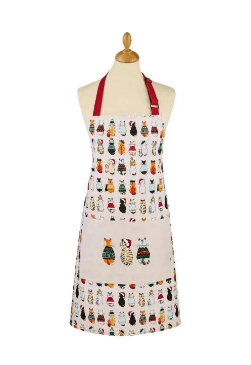 De kerst variant van het Ulster Weavers Cats in Waiting schort is gemaakt van katoen. Het schort is beige met rood van kleur en is voorzien van een kattenprint in kerstsferen. Gebruik het schort om uw kleding tegen spetters en vlekken te beschermen. Het schort is 95 cm lang en 70 cm breed.